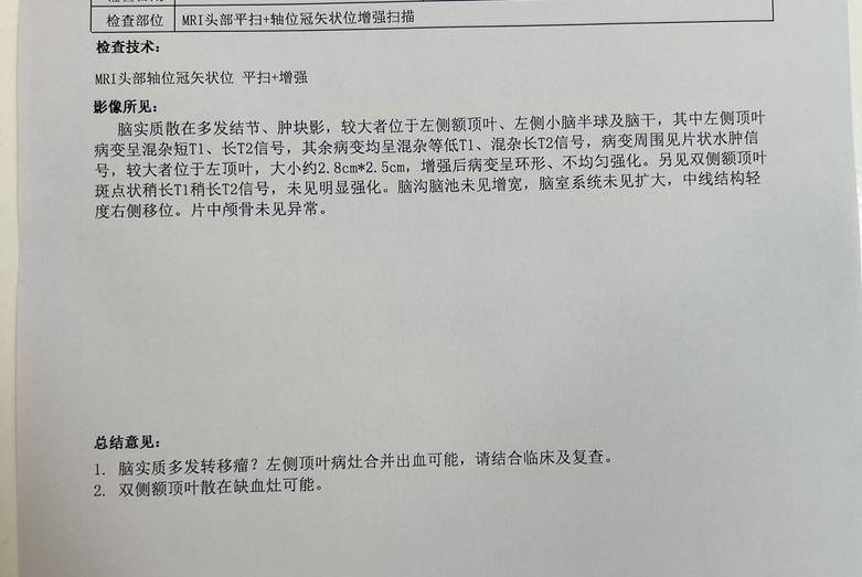 求问各位前辈,父亲腹部、脑部均发现肿瘤,脑部疑似肺癌转移,神外医生建议立即手术切除脑部肿瘤,肿瘤医生建议先输甘露醇降水肿,等肺癌穿刺基因报告再说。现在很懵,求教到底如何处理,谢谢。