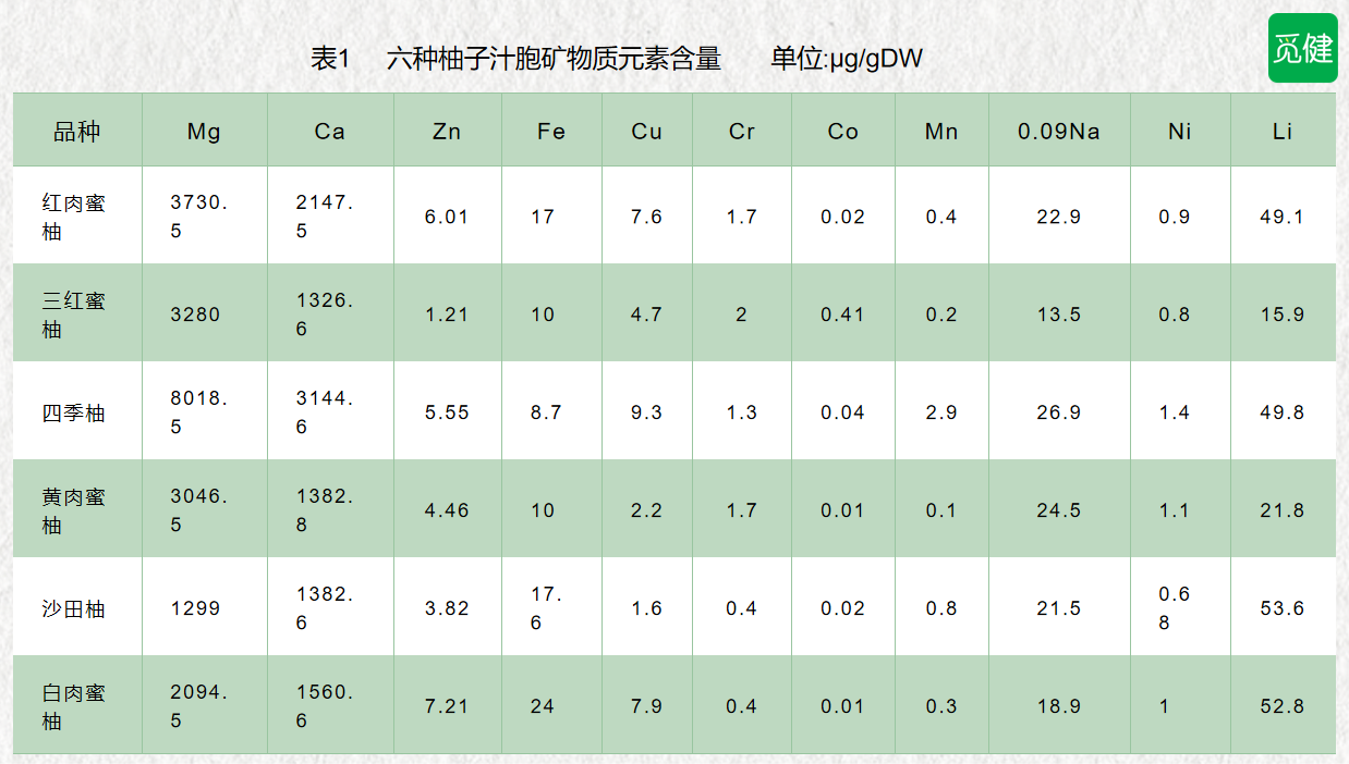 从表1中可以得知,白肉蜜柚的锌(Zn)含量高,想补锌的可以选择白肉蜜柚;三红蜜柚中铬(Cr)的含量高,对于血糖比较需要平稳的来说三红蜜柚会更有益一些[3]。