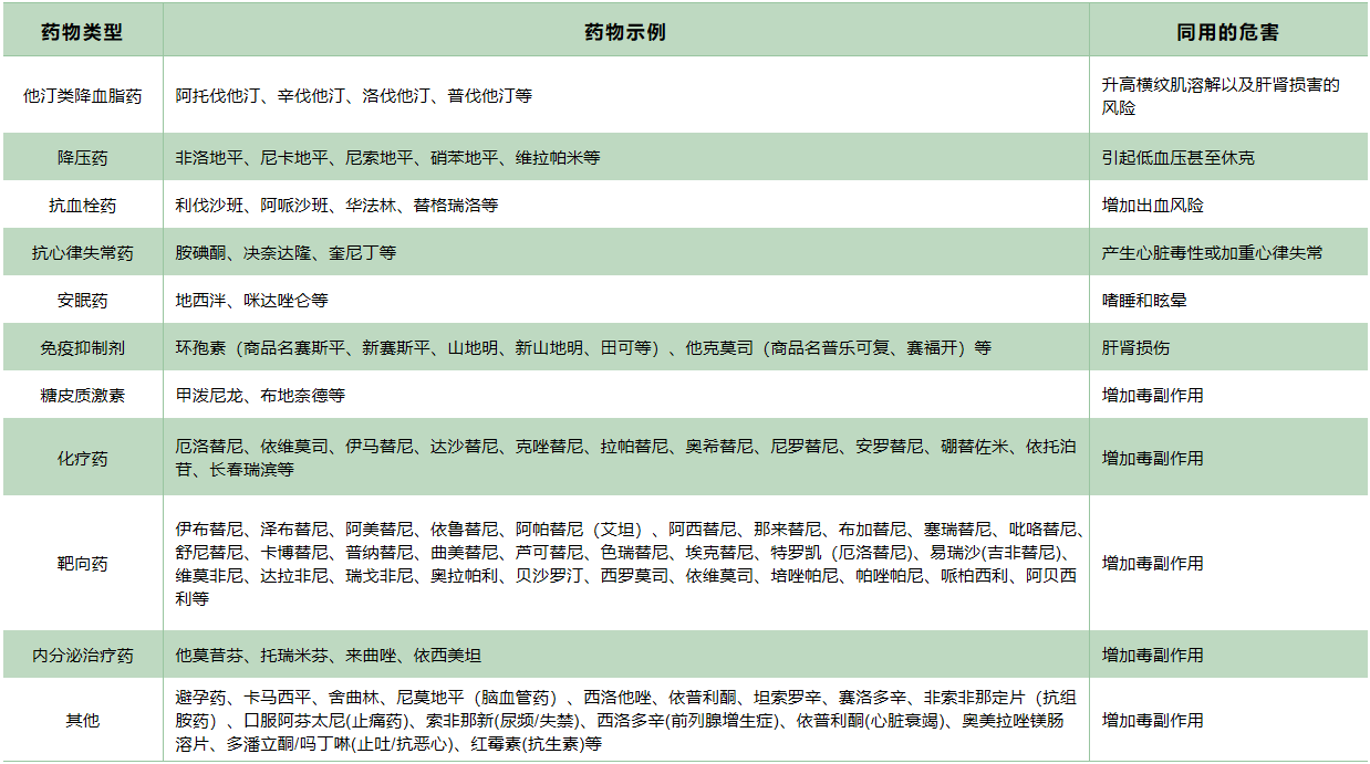 随着相关研究的增多,目前已经发现了80多种药物可能与西柚存在相互作用,以下列举一些常见的受柚子影响的药物[10-11]: