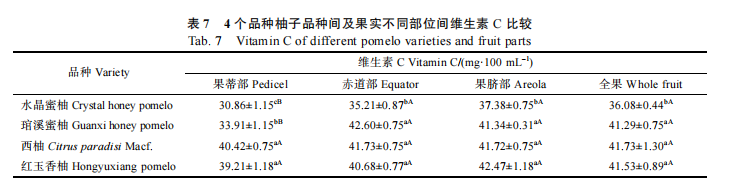 从表7中可以得知,白肉蜜柚的维生素C最低,其他的都差不多,但是总的来说维生素C含量在水果界也是排的上号的[2]。
