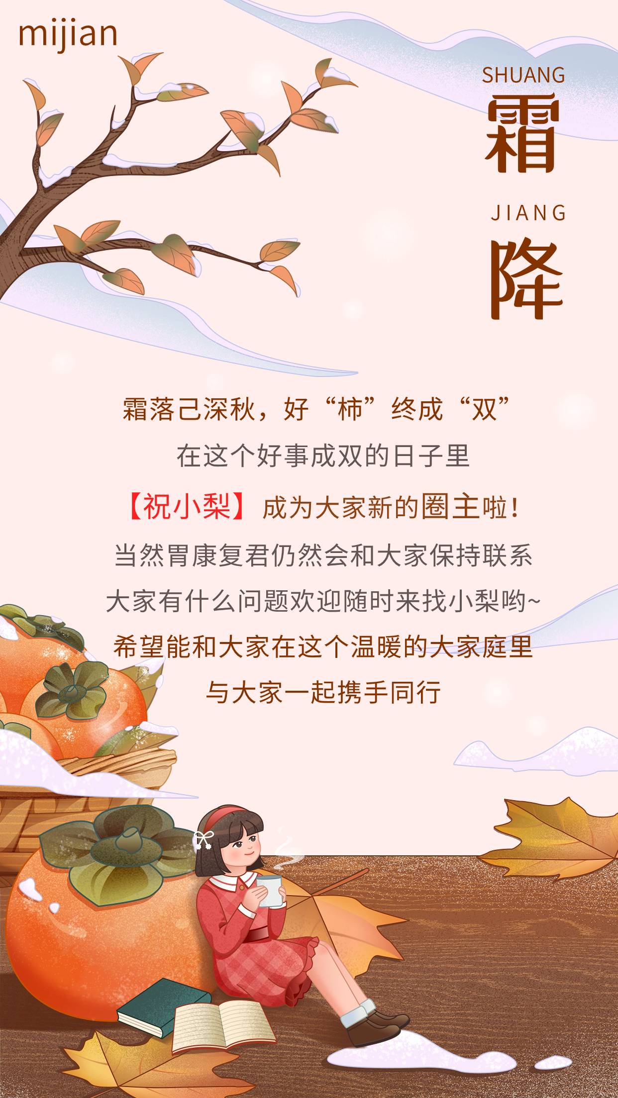 霜落已深秋,好柿终成双,在这个好事成双的日子里,小梨成为新的圈主啦!希望和大家在这个温暖的大家庭里携手共助