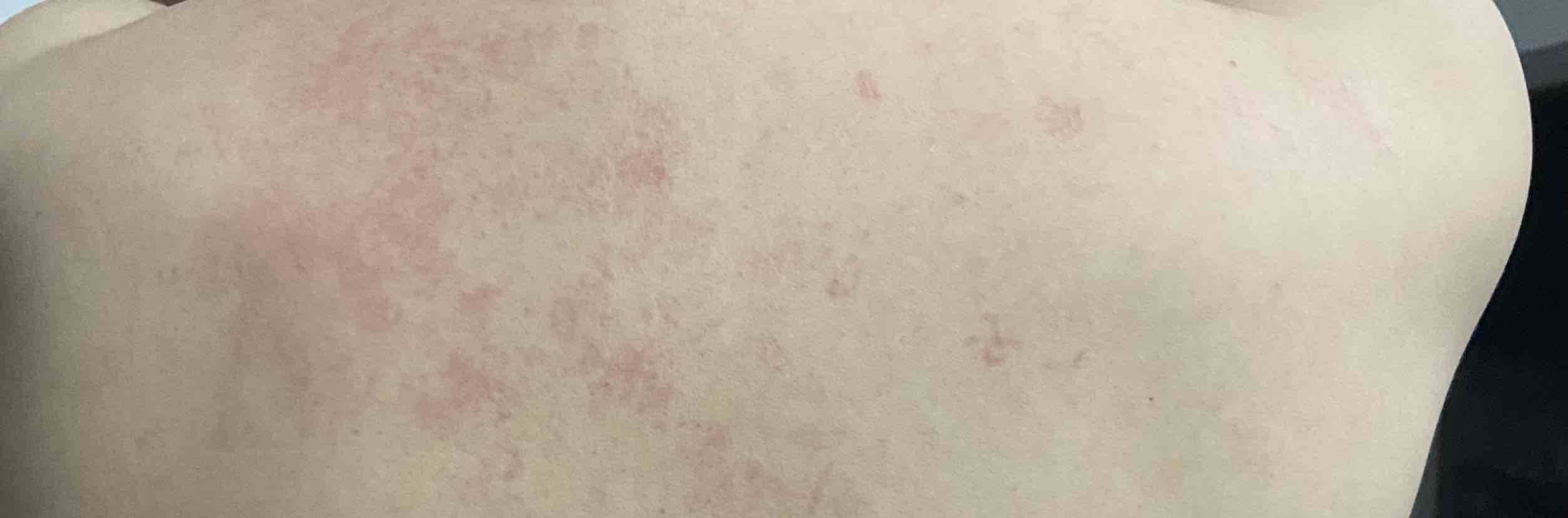 天刚亮我就起来了,实在难受。我吃了点早餐把药吃了准备再休息一下,没想到大概9点多,我突然觉得浑身发痒,起来一看,前胸、肚子和后背长满了荨麻疹,