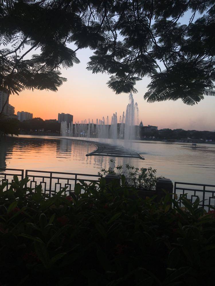 今天散步顺便去了趟银行办事,回来时沿着网红小吃紫荆西堤和牌坊广场走,看到夕阳下的喷泉别有一番风景。