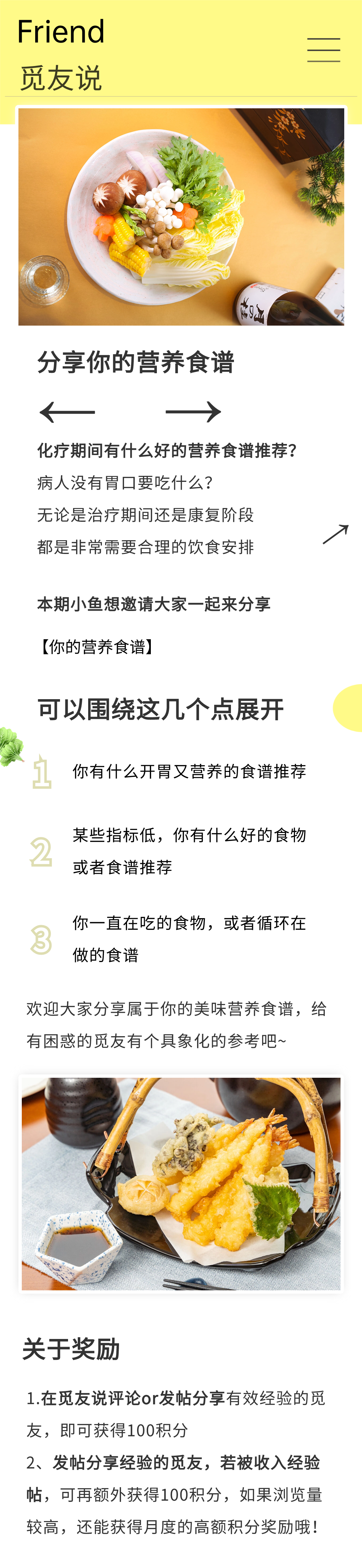 关于化疗期间的饮食,我的体会是能吃就要尽量多吃,不能吃也得坚强的多吃一点,不忌嘴(除了有禁忌症外),不挑食,高蛋白低脂肪,多吃蔬菜和水果,牛奶鸡蛋每天有。可适当吃点海参,血小板和白细胞偏低时,吃过牛尾骨,我很喜欢吃猪蹄子、红皮花生煲汤,主食喜欢吃大米、杂粮豆子稀饭,常年吃山芋(红薯)。不吃保健品,有时喝点医院开的安素。要保护好胃,才能吃得下。化疗和放疗后,体重下降了20多斤,但化放疗结束后三月左右恢复到之前体重,现在几年下来体重都稳定在正常指标之间。