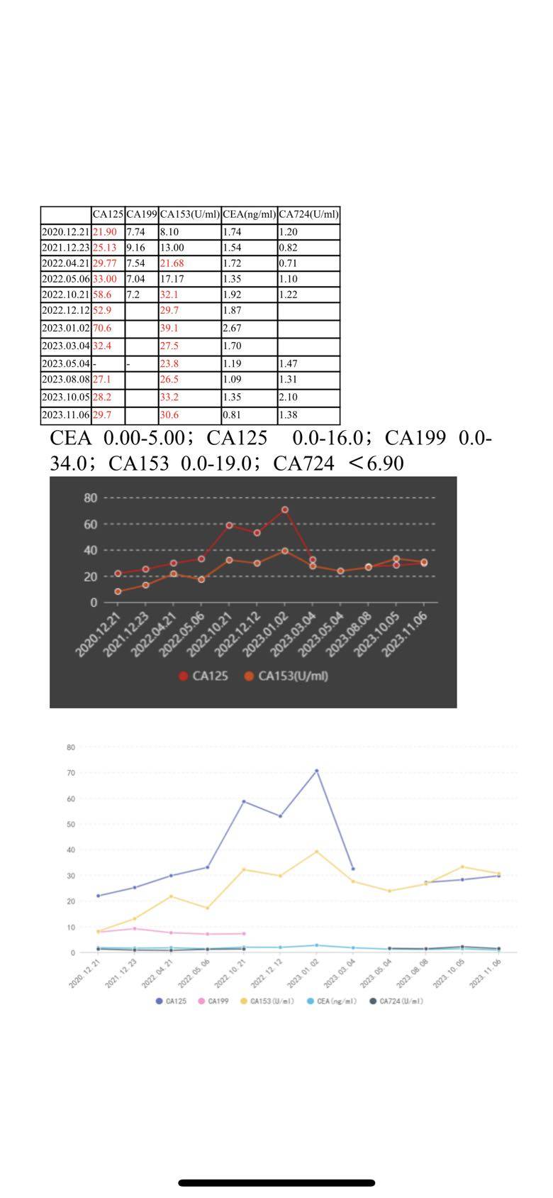 我们是2022.10肿瘤进展,有单发骨转变成多发,治疗方案调整为:氟维丝群+阿贝西利+地舒单抗。吃了2个月出现严重腹泻及感染了新冠,白细胞下降,停用了半个月的阿贝西利,1月份复查CA125及CA153再次升高,后来医生建议继续服用,暂不调整方案,后来指标下降了,但是回顾这一年肿瘤指标,一直处于偏高状态,各位友友们,有类似情况嘛,不知道这是正常的还是说药物控制欠佳,肿瘤处于有活性状态,或者说慢性进展,一直感到不安。