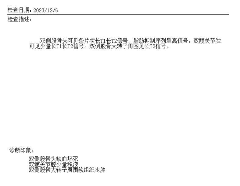 前两天经过病友们的提醒,我去关节外科检查了双髋关节核磁共振和骨密度。检查结果显示骨密度正常,但是双侧股骨头发生了缺血性坏死。医生说现在还处于骨坏的早期,通过停掉激素,减脂,减少负重活动,有可能减缓疾病的发展。
