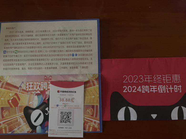 今天上午收到一个包裹,拆开一看是以天猫商城的名义发的一封信,以商城红包的形式要我加二维码好友,这种把戏一看就是骗子,这种骗局就怕贪小便宜,扫描就会中招。