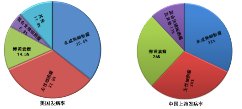 肿瘤发病率是与地区差异性有关的,不同地区发病比例也不尽相同。如下图,供觅友们参考。 研究对比,美国和上海地区,都是未成熟畸胎瘤发病率第一,其次是无性细胞瘤,上海地区卵黄囊瘤发病比例明显增高,达到26%。