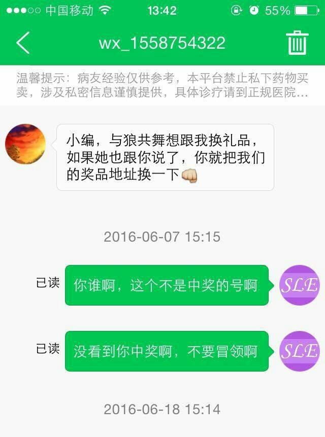 原来我的质疑是正确的,难怪楼主怎么没把截图截全了。。。试想如果你是觅健的管理员,你用一个id不一样的号来领奖品,能给吗?当然要质疑你是谁呀。。。有好几个病友都把自己奖品送人,觅健都处理的好好的,相信你用中奖的号私聊小便,这件事情就不一样了。。。