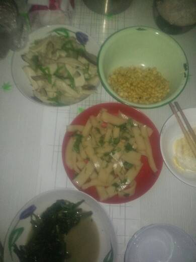 红色盘子是凉粉,用不粘的米打成米浆,再加点碱熬熟,再放盆里冷了就是凉粉了。我们以前用石灰水,现在没有石灰了