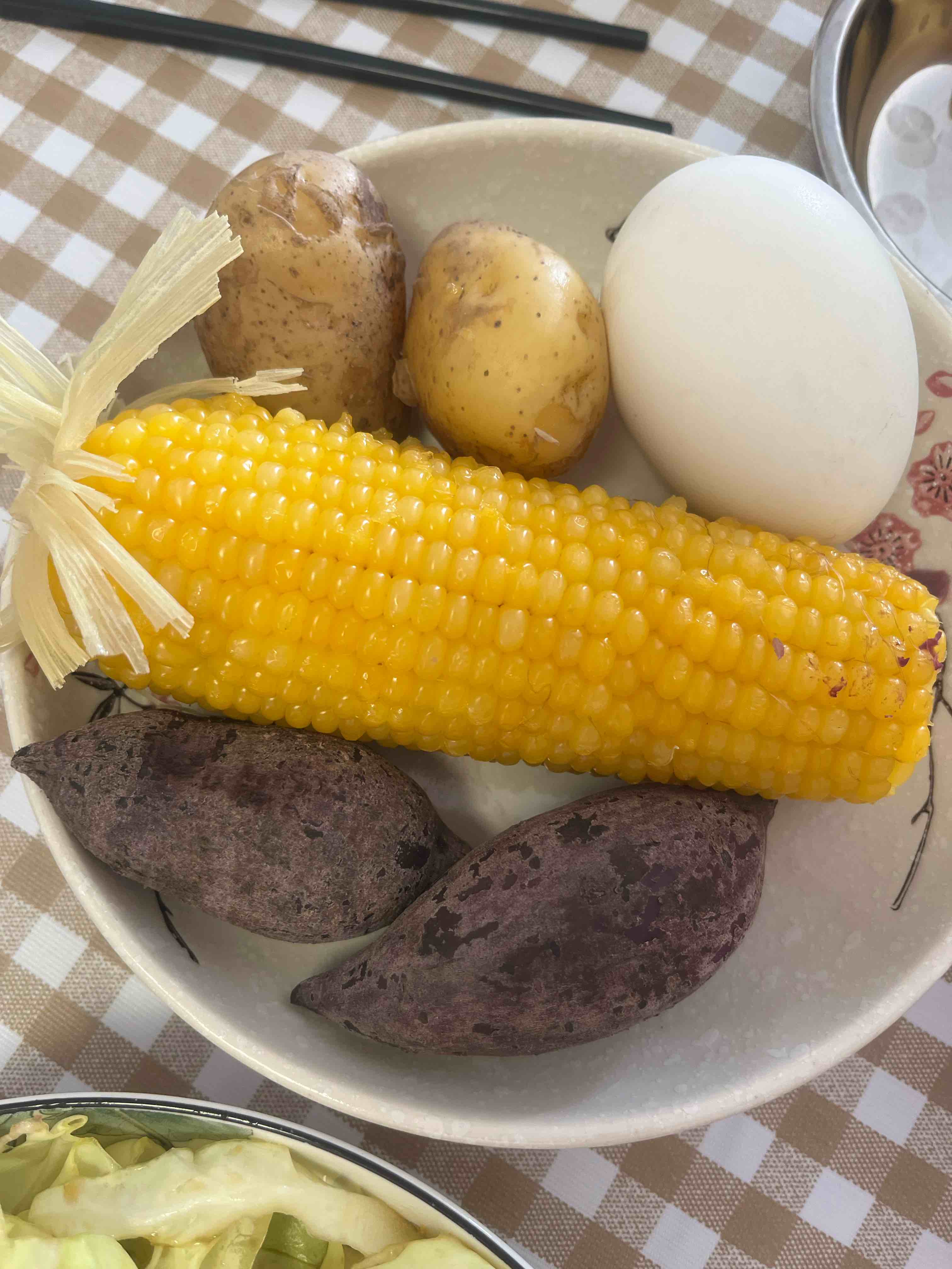 紫薯土豆玉米鹅蛋,拌菜,牛奶山药青汁粉
