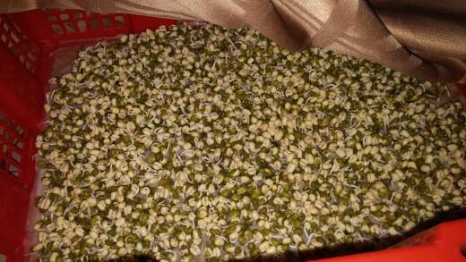 孝子發豆芽給我吃。(突然觉得做人阿媽前途一片光明)喜孜孜的浸豆—天又發豆芽一天。隔若干小時還一下水,又拿了我的枱布細心遮光防豆芽發黑。