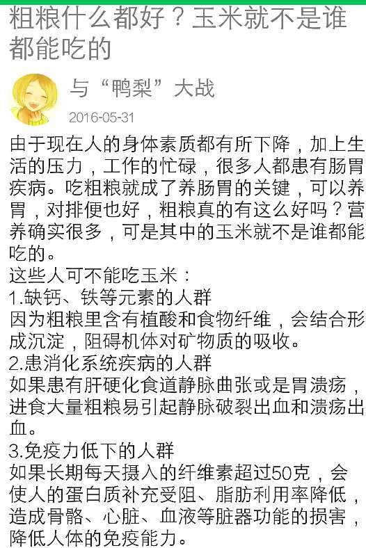我觉得没必要看这些东西,看完我们没多少能吃的,玉米不能吃,玉米须煮水岂不是也不能喝? 我水肿的时候喝了半年玉米须水,消肿利尿蛋白还没了, …… 以前人都吃玉米饭窝窝头照样也是身体棒棒哒。 粗粮还是很有好处的。