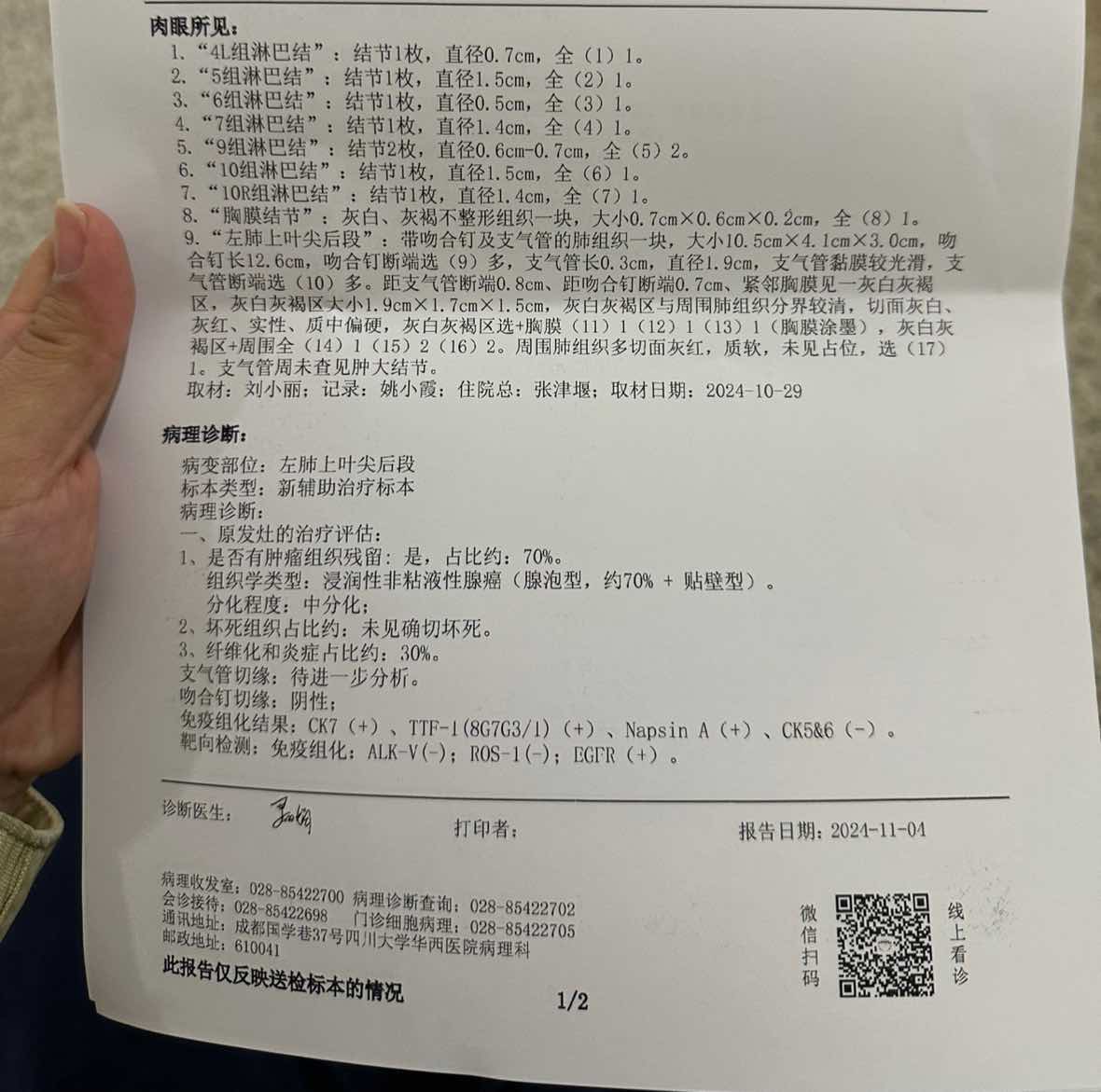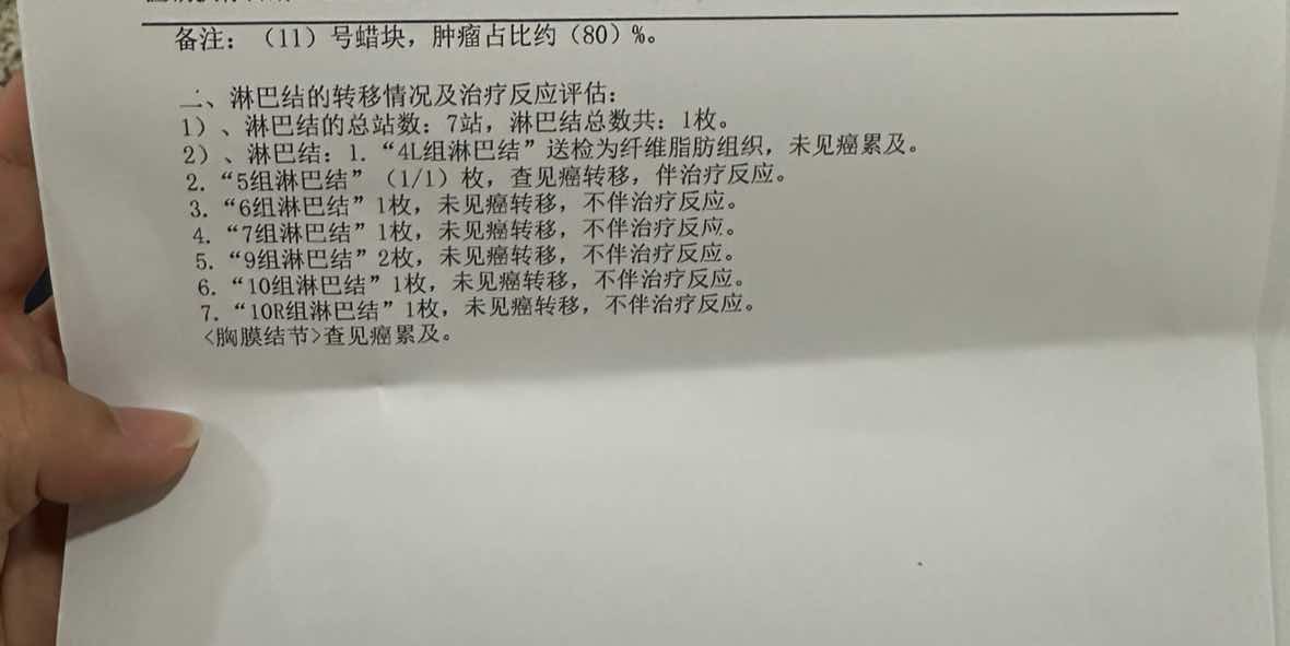 医生建议化疗,因为接受不了后试奥希,病灶缩小,后在华西评估可以手术,吃药六个半月在华西手术,术后大病理残留百分之70