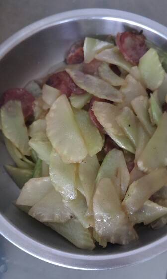 今天,腊肠炒莴笋,盐水薯苗,腐乳薯腾!