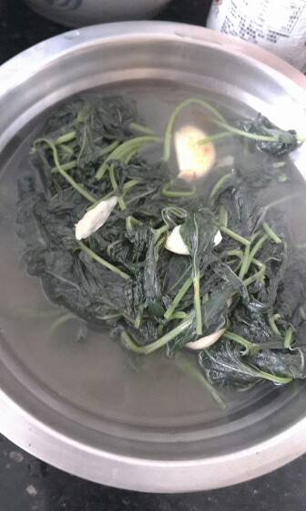 薯苗,爆蒜头,在放薯苗,放水,放盐,煮一会,熟了就可以,很滑,很嫩的哟,你家有也试试!