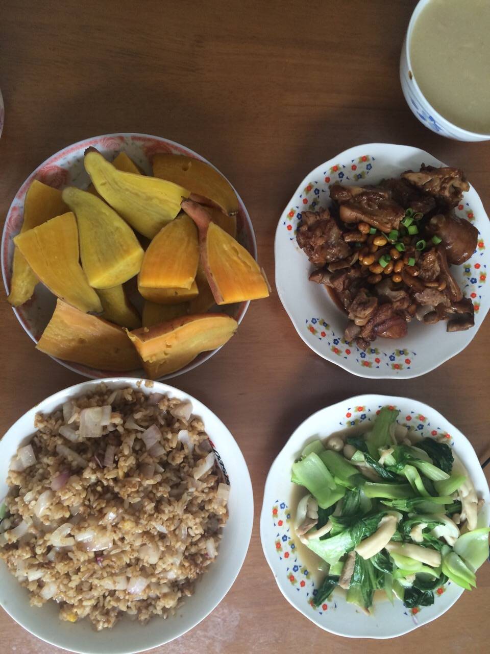 烧猪蹄 蒸地瓜 酱油洋葱鸡蛋炒饭 油菜海鲜菇