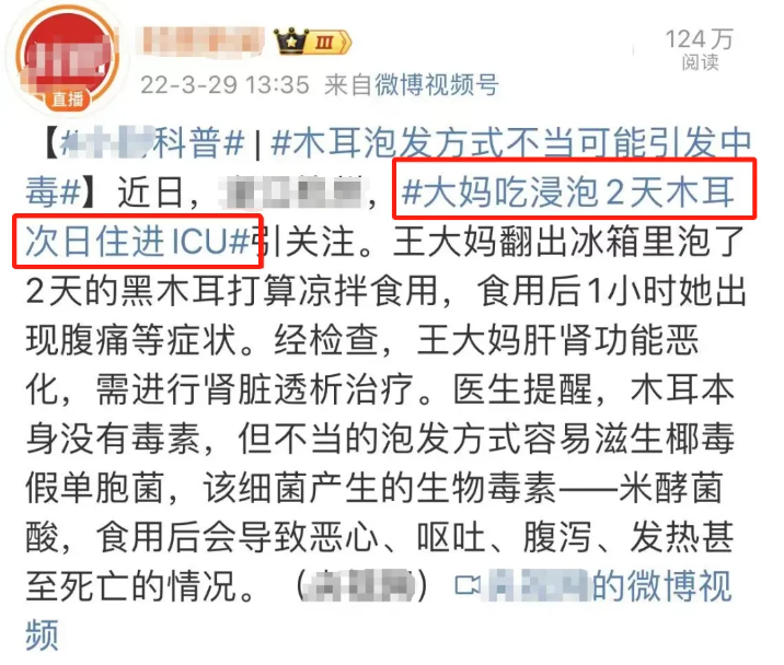 而且,吃黑木耳前泡发时间最好在2-3小时,因为木耳泡发时间过长可能会产生米酵菌酸毒素。米酵菌酸毒素随食物进入人体后,不但没有保护肾脏的作用,还可能伤肾[7]!