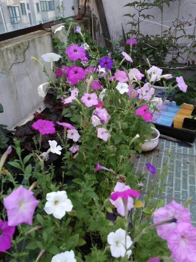 清早给大家看看花,一天心情好,都是我自己种的,月季又谢了一茬,现在矮牛开的欢,就是自己育苗,没有那么多盆,挤在一起,活活把矮牛挤成森林了