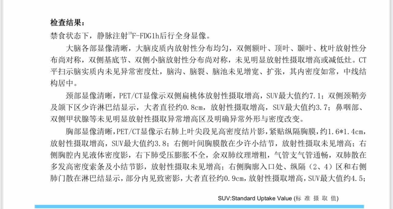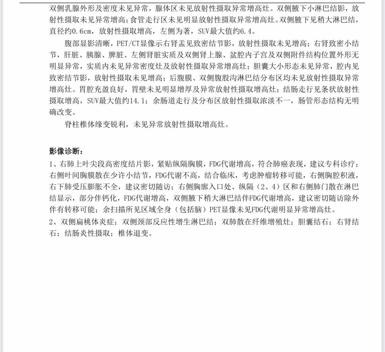 本人母亲于2月底检查出肺腺癌,EGFR21 L858R突变。从3月6日起,服用奥希替尼2月左右。原病灶(2.7*1.6),服奥希替尼8天后病灶显示(1.6*1.4)。想问下各位病友及家属,我们这种情况有手术可能性吗?感谢各位建议,跪谢!后附PET CT检查结果。