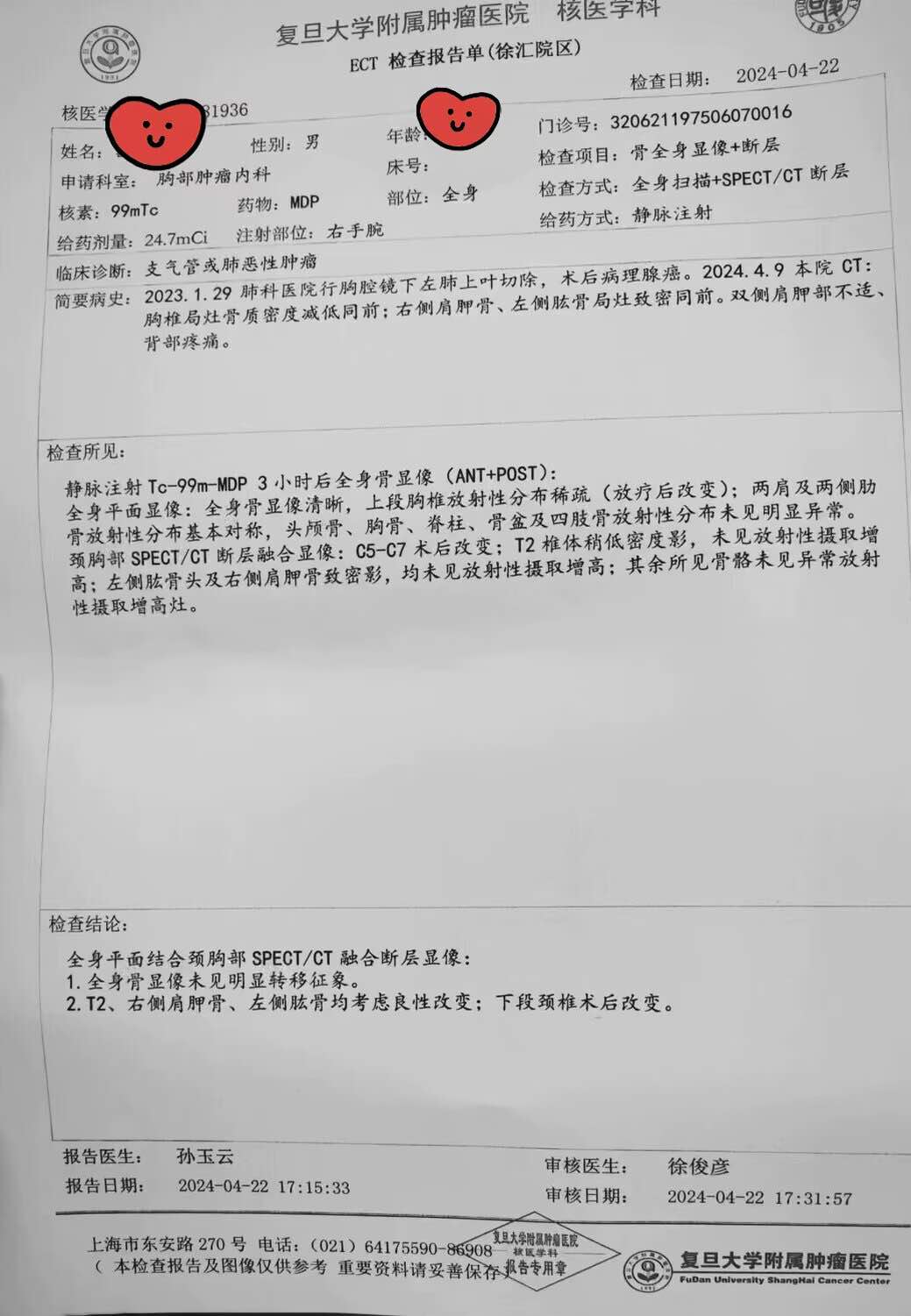 2024年4月初的胸部CT报告中,多了一处胸椎局灶骨质密度减低,还有右侧肩胛骨和左侧肱骨局灶致密。主治说问题不大,但我心里始终不踏实,就督促🐰兔先森做了一次骨扫描。检查结果显示,三处均考虑良性改变。👇