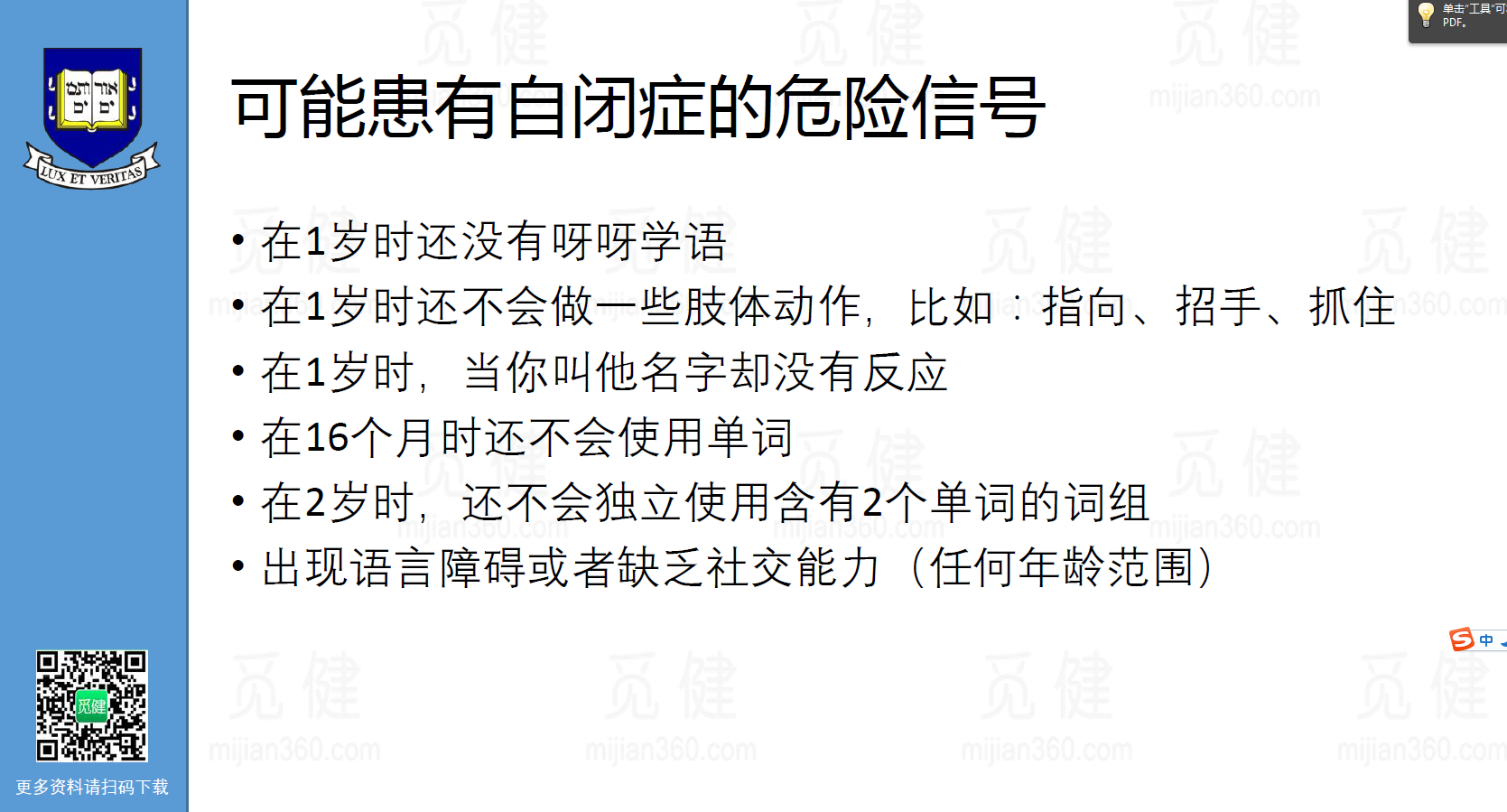 耶鲁大学的儿童研究中心开设了关于自闭症以及相关疾病的研讨会,可以说是开创了全美国的一个先河。课程内容涉及到针对自闭症进行检测、诊断、治疗、家长引导方法等内容。今天圈圈分享的这个就是有关耶鲁大学的演讲:自闭症父母的角度与支持的实操内容