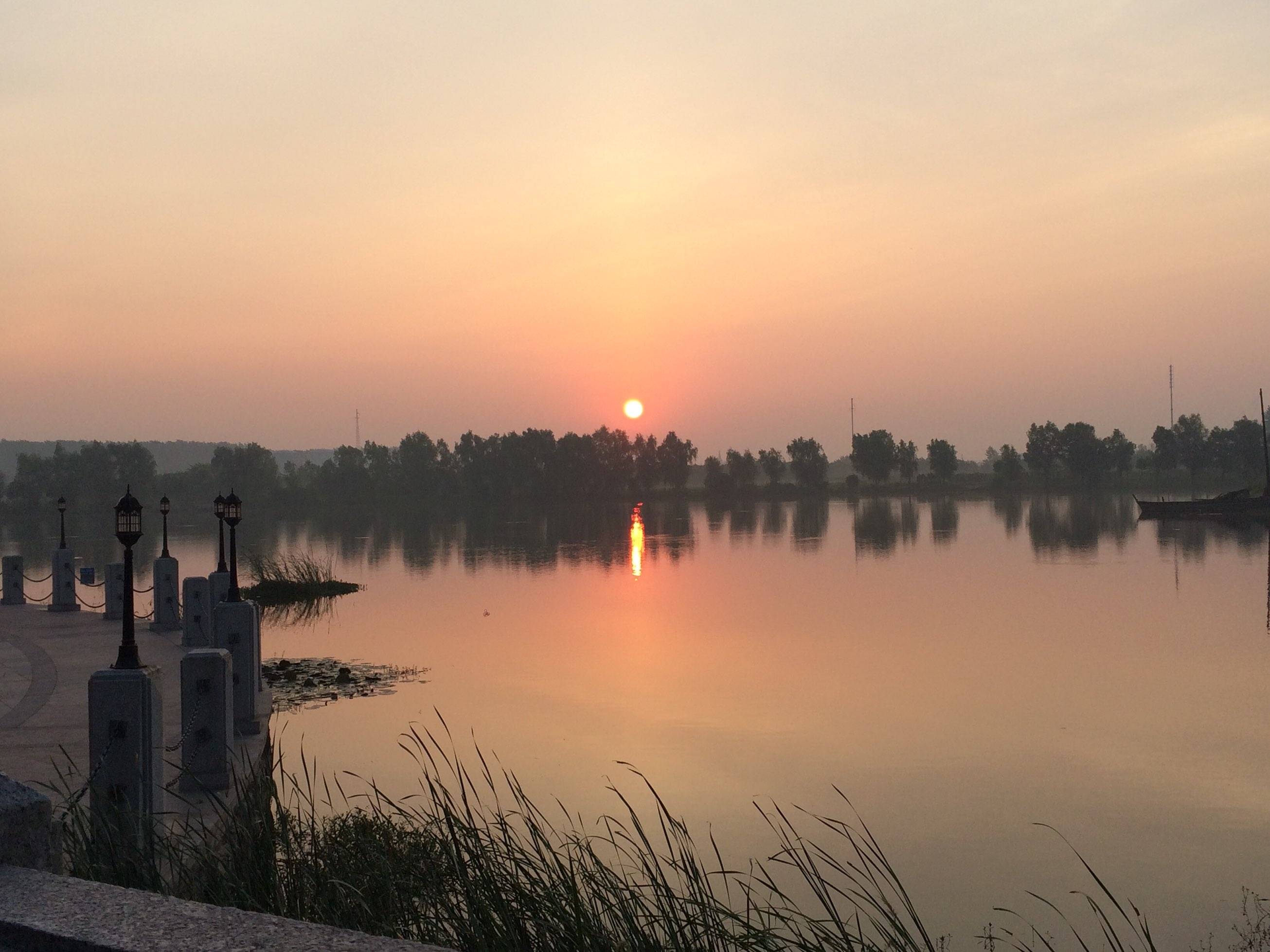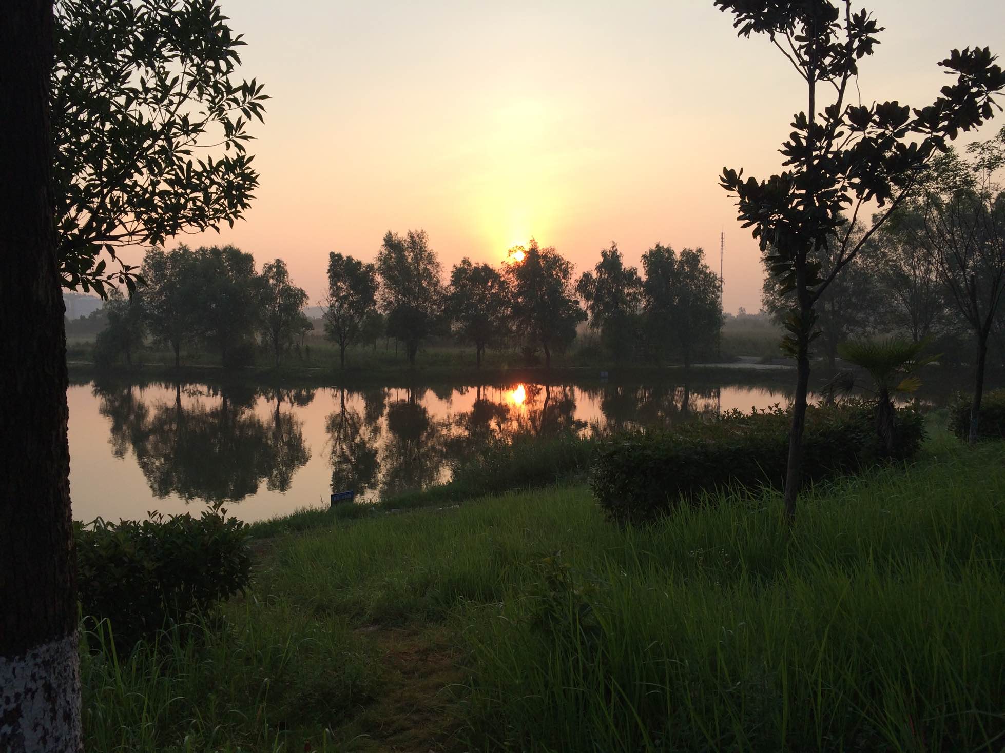 伴朝阳湖水照倩影,沐晨风青草抚芳踪