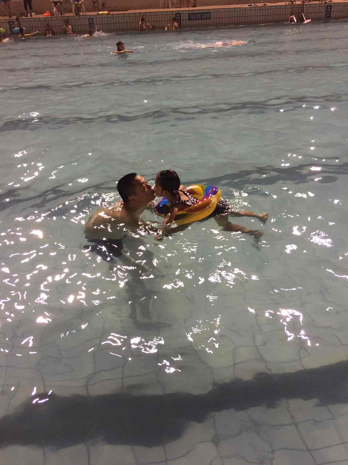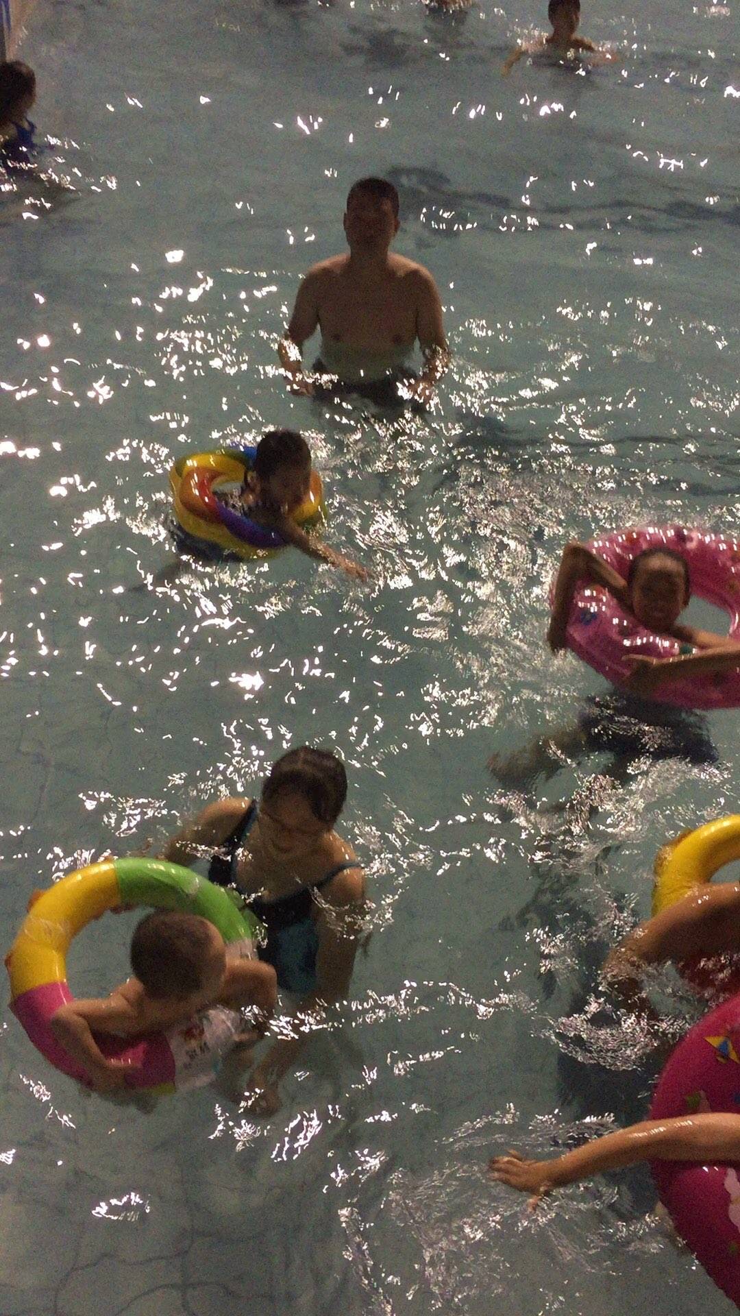 小家伙第一次来游泳,很开心