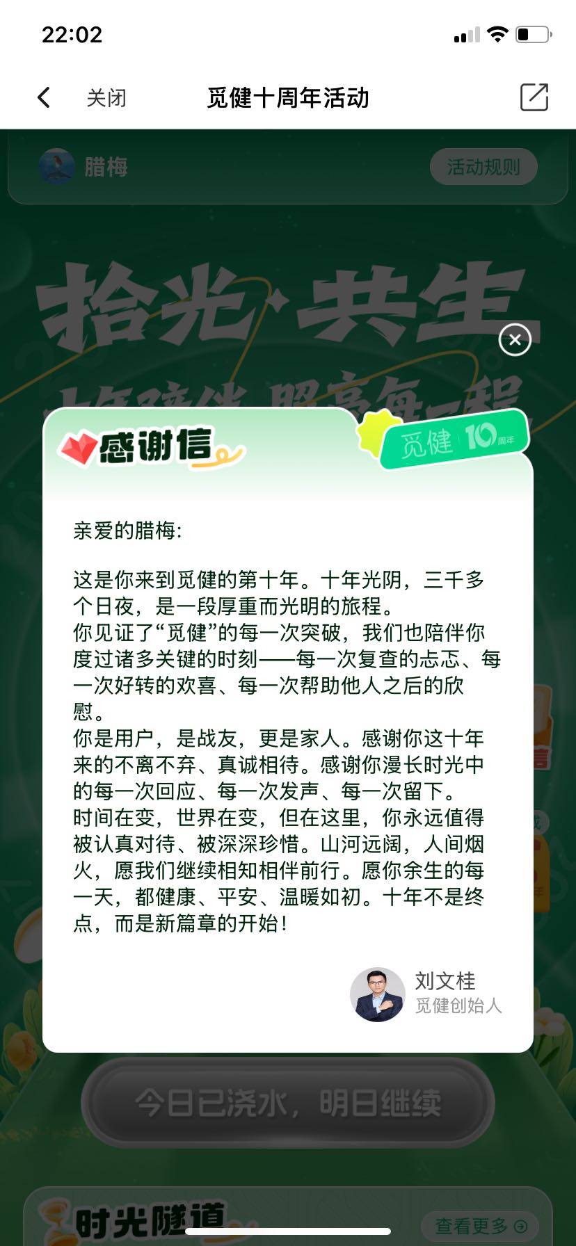 收到刘总感谢信啦,非常开心也非常感动。今天是我重生十年的日子,正如刘总所说的十年光阴三千多个日夜,是一段厚重而光明的旅程。十年不是终点而是新篇章的开始,让我们一起奔赴下一个十年之约!
