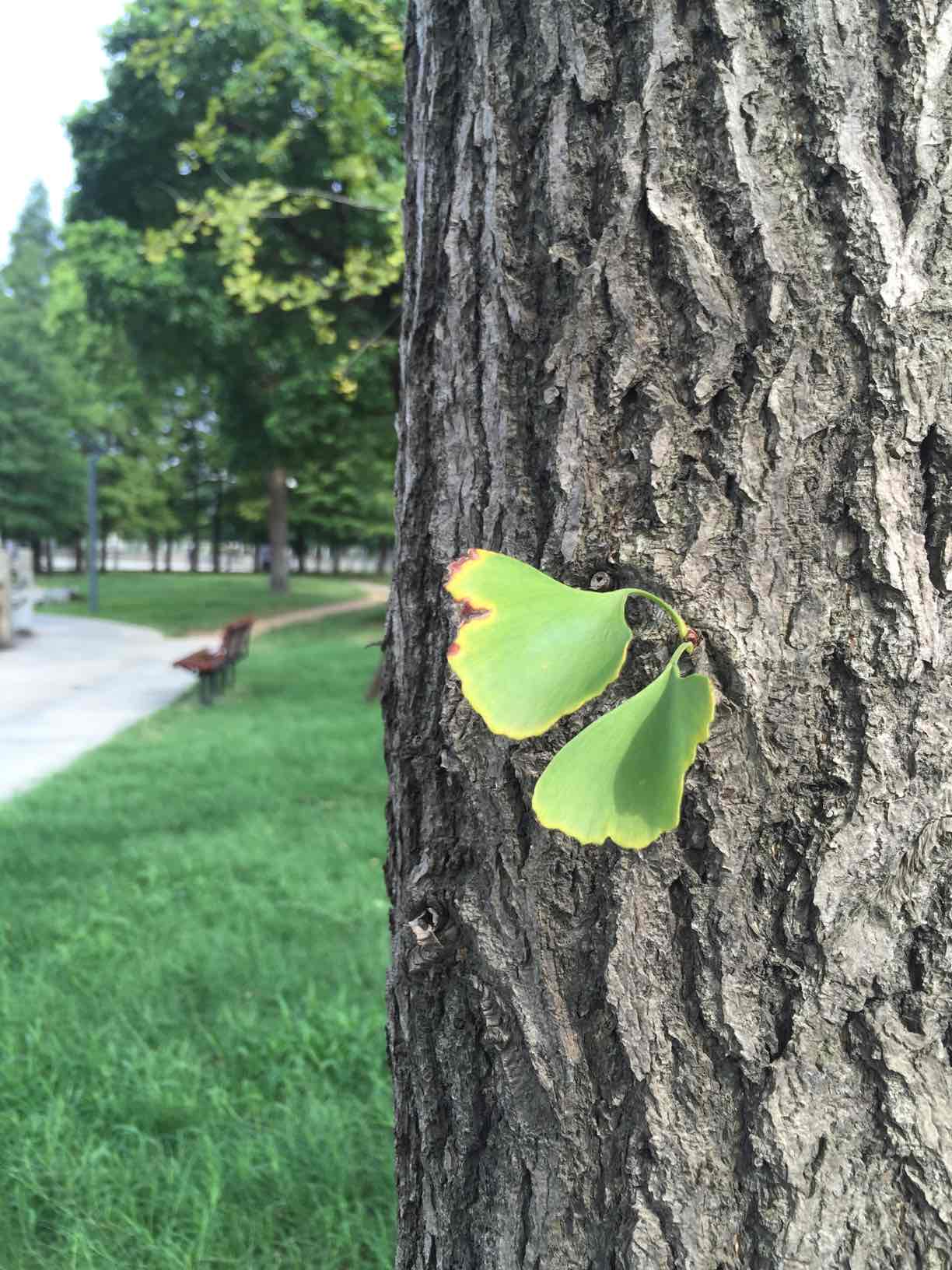在公园里看到一棵树干上长出新叶,赞叹生命的顽强,只要它想发芽、 生长,任何地方都可以。