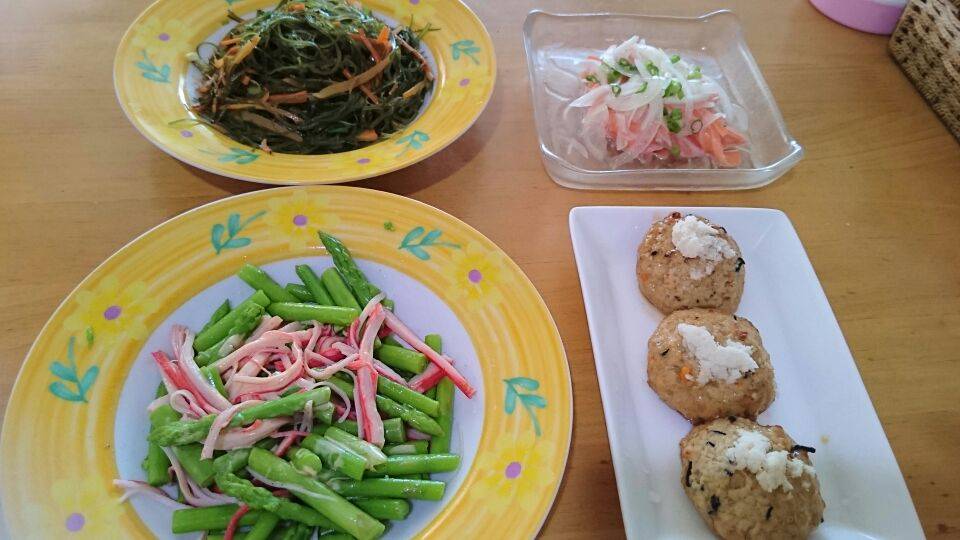 胡萝卜海带丝,芦笋拌蟹肉棒丝,洋葱三文鱼色拉,豆腐汉堡,自己做的吃起来就是香😍