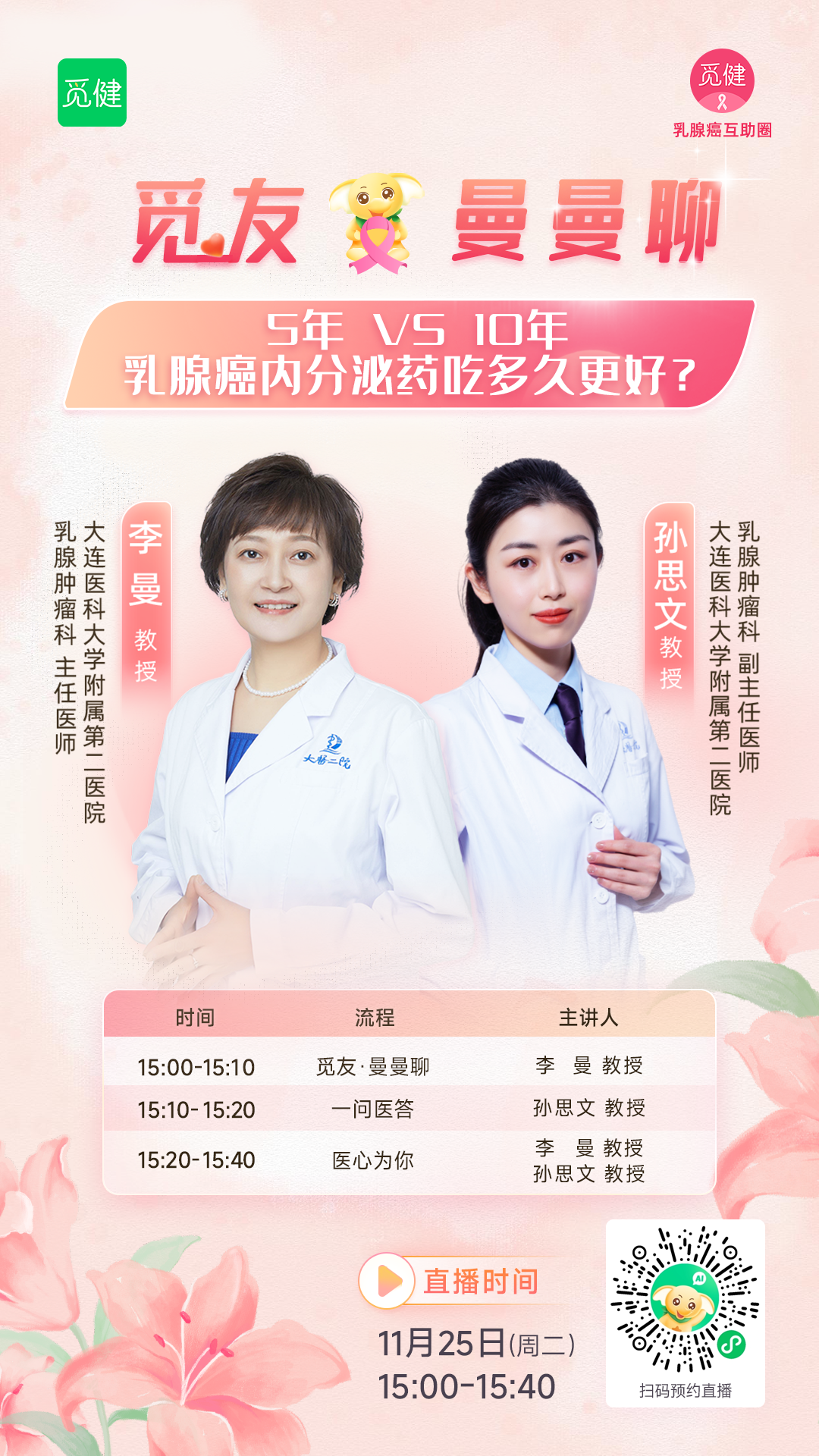 下一期【觅友·曼曼聊】将会带来主题为“5年 vs 10年,乳腺癌内分泌药吃多久更好?”的直播!快长按下方海报,点击识别二维码预约起来吧!