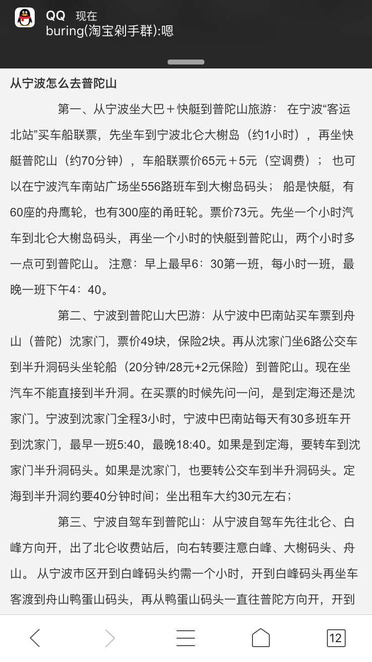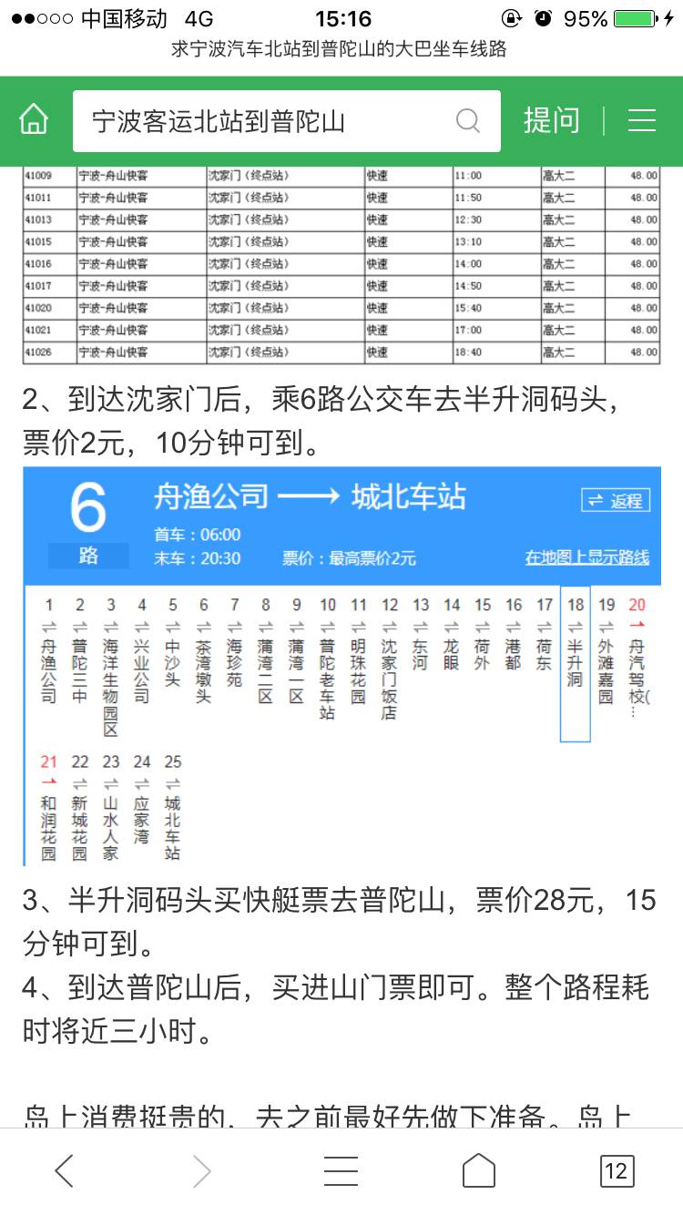 今天终于找到了去普陀山的旅游路线啦,本想跟团,后来想想不是那么自由,还是自己自由游。26号去宁波接到爷爷奶奶后,直接去舟山,行程大概需两个半小时,在普陀山附近预定了布丁酒店,27号就直接可以去普陀山旅游啦,27号在住一晚,28号可以在游半天,下午到宁波姑姑那住一晚,29号可以回家啦!哈哈!感觉很完美,如果想要去这旅游的友友们,以后可以参考我的线路噢