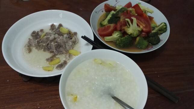 清蒸瘦肉、西红柿炒西兰花、百合稀饭。