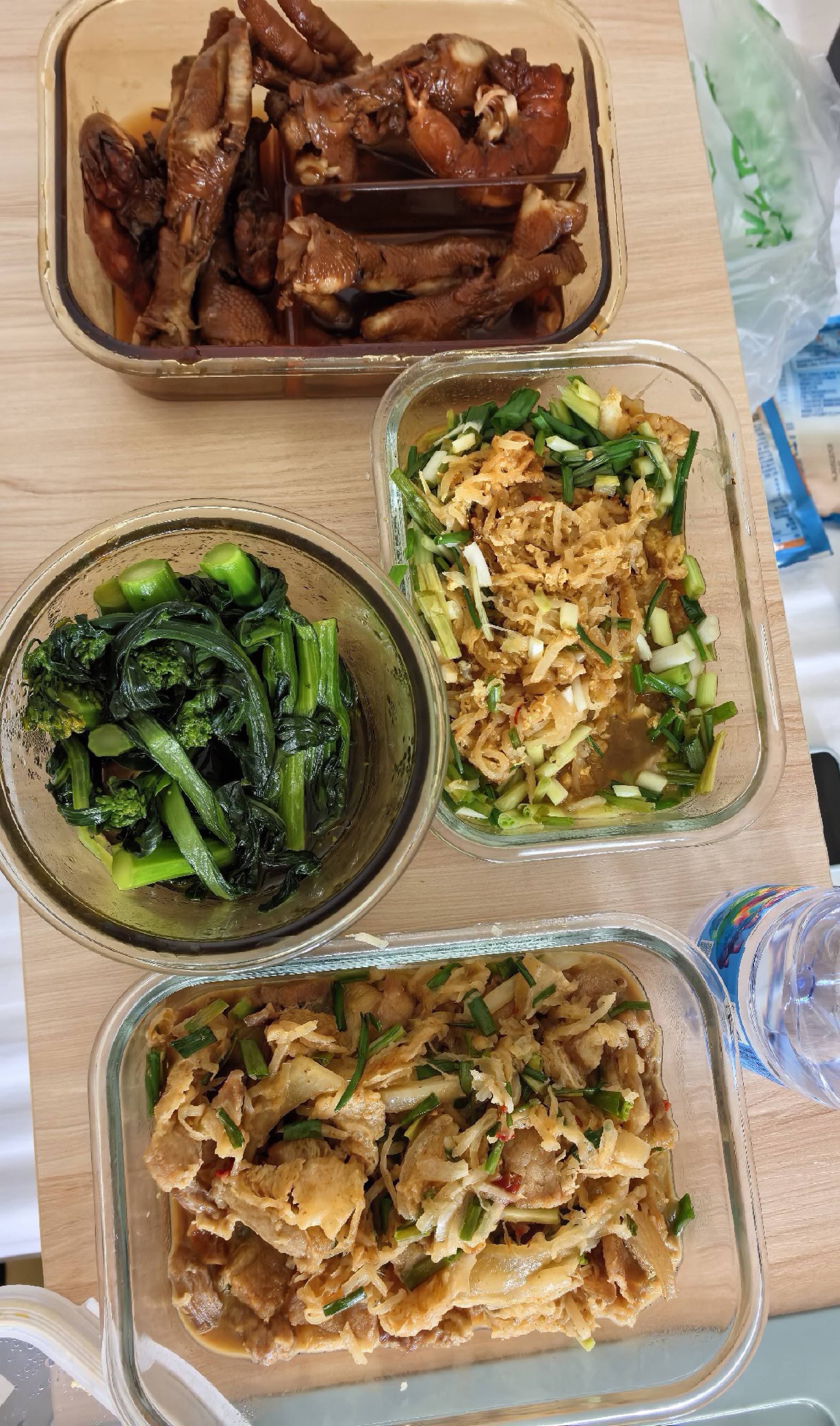 图一: 捞汁鸡爪和大虾,白灼菜心,萝卜丝炖鱼,萝卜丝炒肉