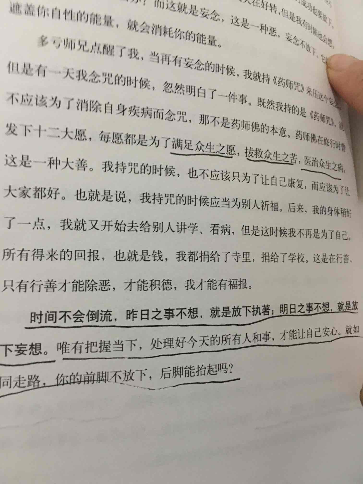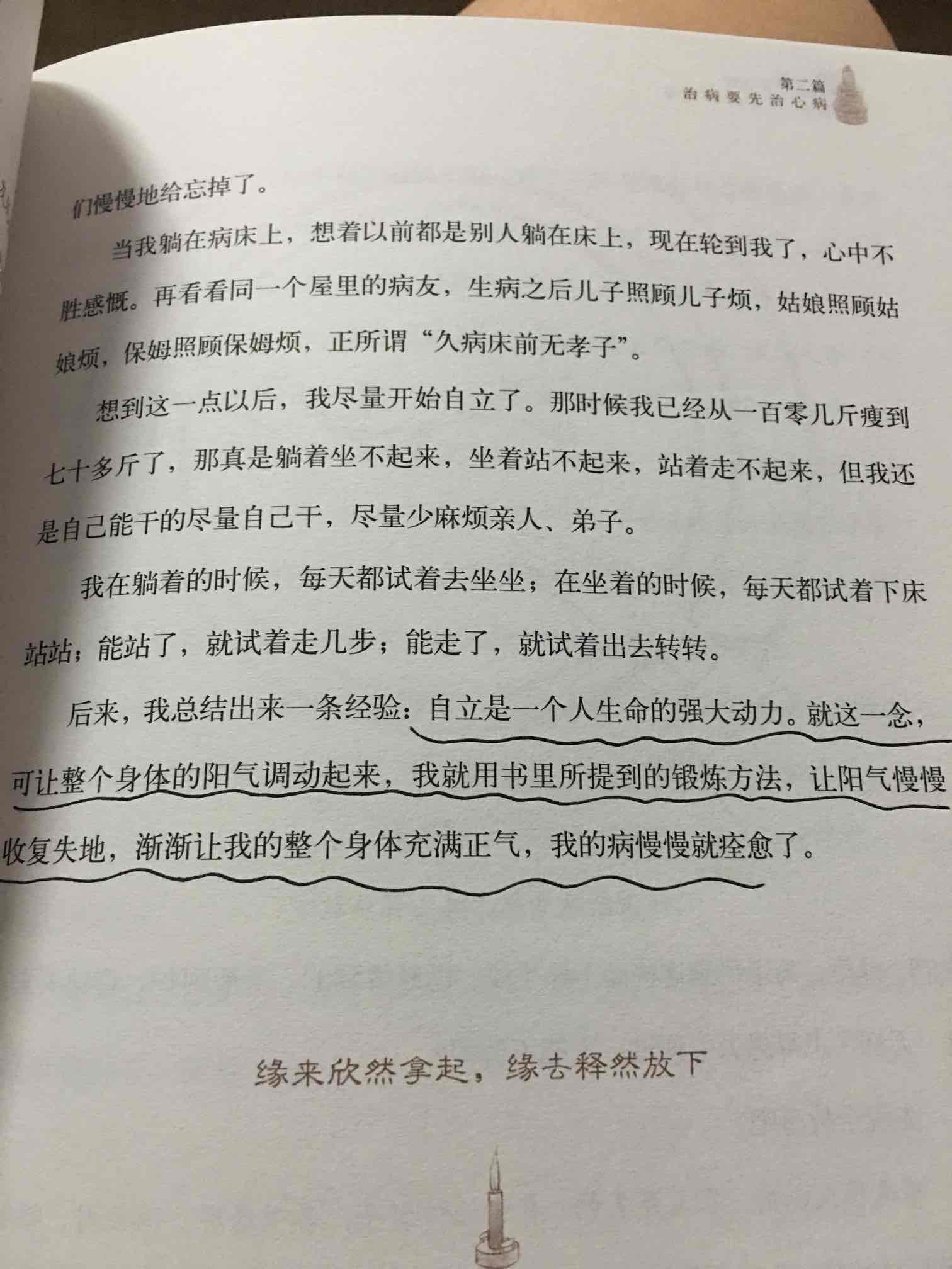 周末陪女儿上钢琴课,伴随着钢琴的声音,细细的品读这本书,内心无比安宁,似乎忘了自己是个病人。《心乃大药》一本治愈系书籍,让我受益无穷,按照书中的方法积极实践中~不去追求结果,脚踏实地的过好每一天!