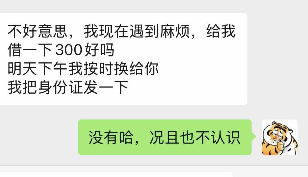完全不认识没见过面的一个维族,之前加过就再也没有说过话,这两天突然对我特别关心,时不时的聊天,直觉告诉我,她要找我借钱了,她儿子的轮椅几万块,找我借300,拒绝在我这边不是一个很难的课题,不知道把身份证发我啥意思,这几年有不少人找我借钱。我基本上就是直接拉黑,要么备注爱借钱hhhh自从得了精神病,整个人都精神多了