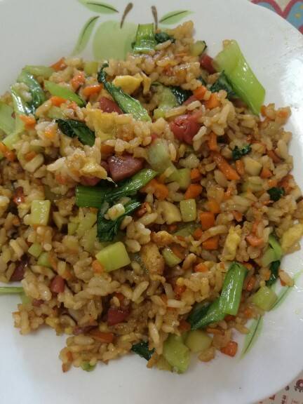 这是我超级省事的保留菜谱,#超级什锦蛋炒饭#。猜猜有几种原料。鸡蛋,香菇,胡萝卜,黄瓜,小油菜,香肠。主食是昨天的米饭,方法同蛋炒饭,其中胡萝卜,香肠要先油煸会。充分把胡萝卜素煸出来。最后再放入黄瓜,油菜。10分钟就可以搞定的午饭