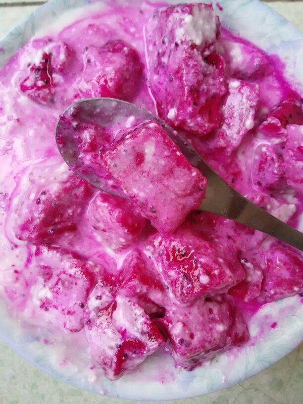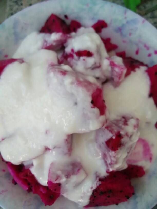 2、大约半个火龙果,倒入120ml的酸奶,进行搅拌。