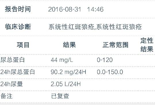 这个复查,尿蛋白已正常了,基本上每月都是逐渐下降的,五月份的时候还是1910mg,六月初1200mg,六月底850mg,七月底查了217mg,这次终于正常了,明天去找医生,现在三片激素一个月了,医生应该会再给我减半片激素吧,希望瘦脸瘦脸。