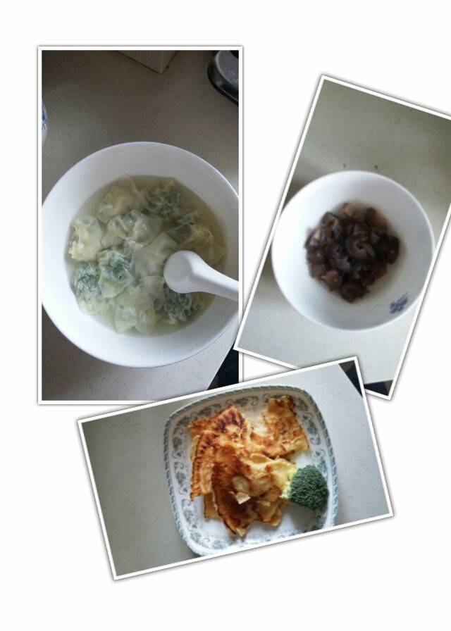 每天看到好多姐妹晒早餐都是色香味俱全,真让人口水直流啊,今天也学着做做:自己包的芹菜馅馄饨、鸡蛋饼、海参一个。