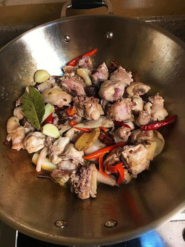 2、放油,放葱姜蒜辣椒,放佐料,把鸡肉炒5分钟,然后直接加半锅热水,加酱油、盐、料酒把鸡炖40分钟,出锅前再把木耳放鸡汤里炖熟;