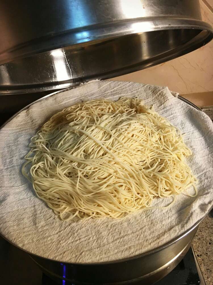 4、把面条放锅里蒸20分钟;