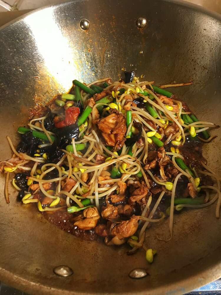 5、把鸡肉捞出来,去骨,盛一碗鸡汤。木耳切丝,把配菜和鸡肉放锅里翻炒,加酱油,最后倒入鸡汤;
