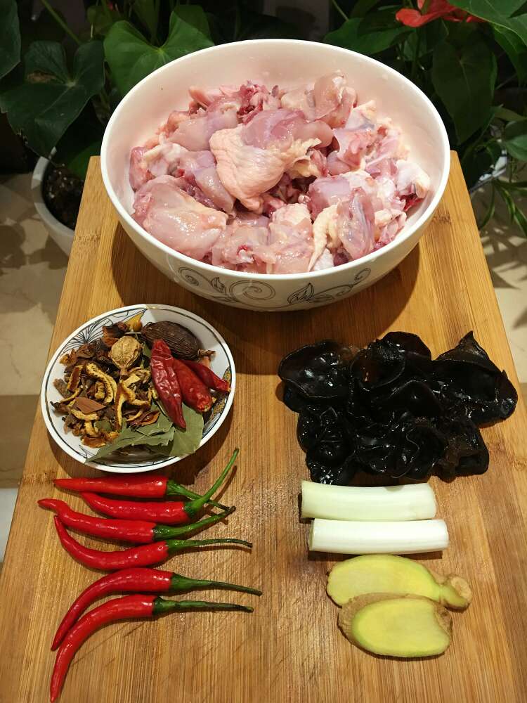 1、准备鸡肉、木耳、葱姜蒜辣椒、干佐料;