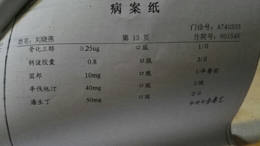 结合骨坏的原因,应该庆幸在治疗过程中大夫的认真负责。固邦、骨化三醇、潘生丁(预防血小板聚集血栓形成)、钙健胶囊、辛伐他丁,这些都是我当时大量激素和免疫制剂时,同时服用的药品,大家可以参考一下。
