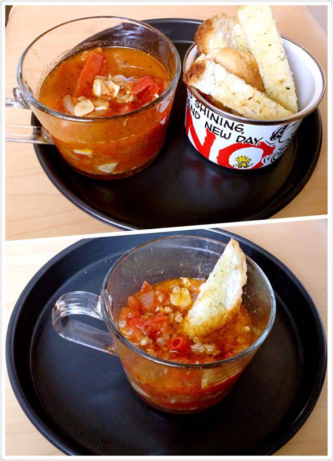 番茄应该用搅拌机打碎再煮,我偷懒了,面包比买的稍微磕碜了点,没办法,这不赖我,面包机烤的。