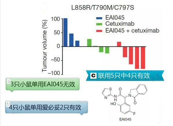 第一,第四代靶向药EAI045已经横空出世。它针对的是第三代靶向药耐药后所出现的C797S突变。EAI045与爱必妥(西妥昔单抗)联用,从目前的小样本动物实验结果来看,起效率高达80%。但目前该方案还在动物实验阶段,真正应用于临床,还很遥远。