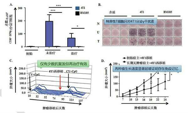 第三,免疫治疗取得了意想不到的效果,免疫记忆原理被发现。无论是现在已经商用的PD1还是其他仍处于实验阶段的免疫疗法,人们都惊喜地发现,有一部分接受治疗的病人,在停止用药后的很长一段时间都没有复发。这种情况是之前在靶向治疗中从未出现过的,接受靶向治疗的病人,一旦停药,很快就会复发。研究人员将这种现象成为免疫记忆功能。直到最近,研究人员终于发现了其中的科学原理。肿瘤特异性T细胞肿瘤细胞周围分泌γ干扰素,帮助机体对抗癌症并且能留下免疫记忆来降低复发率。