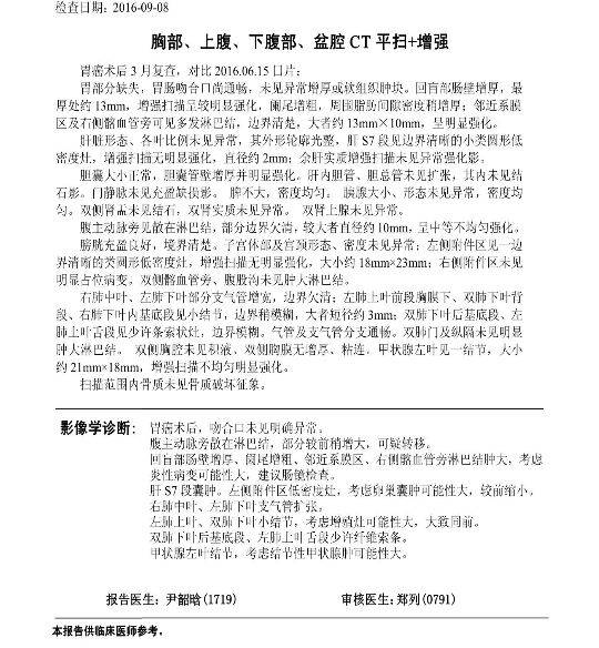 胃手术三个月报告